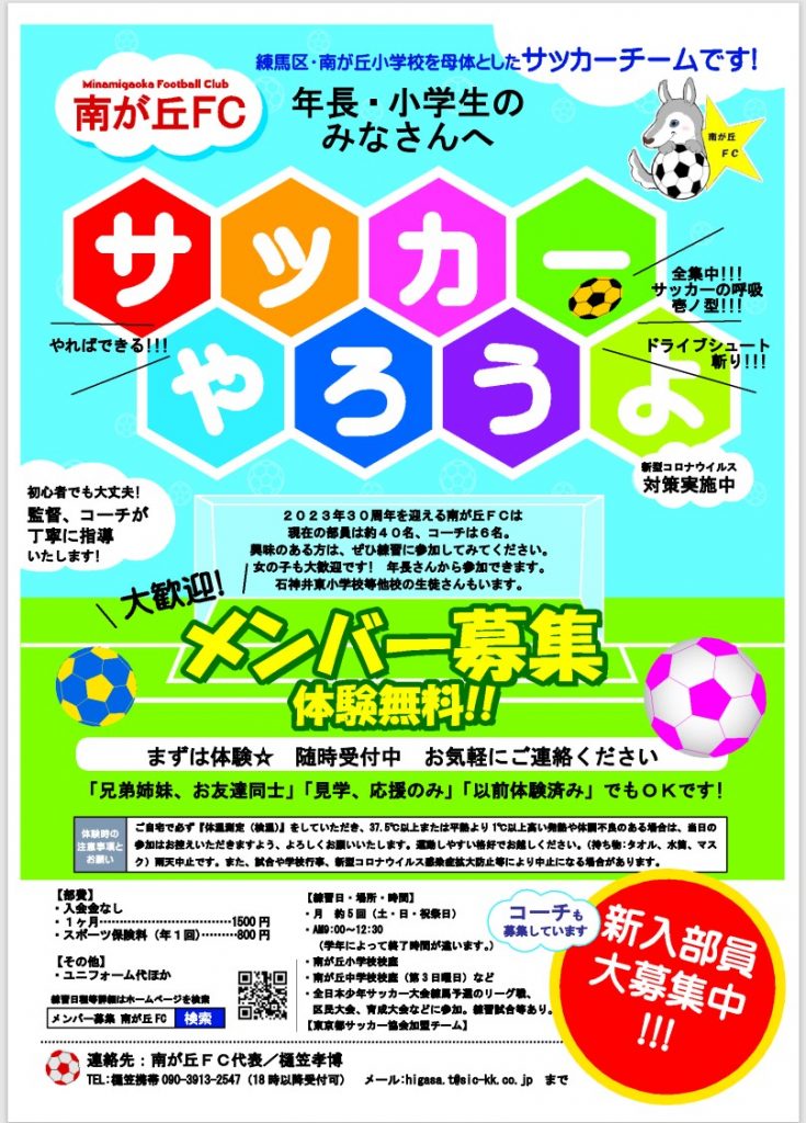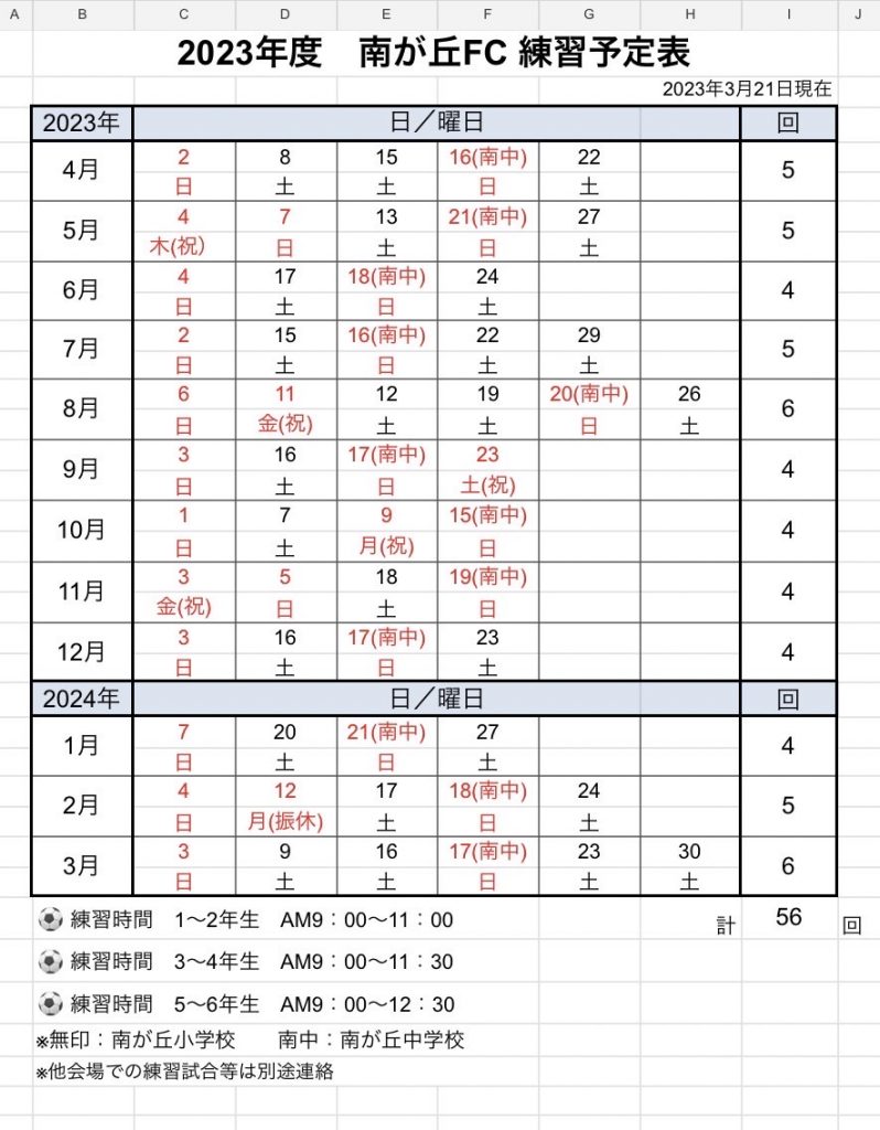 【メンバー募集!!】 南が丘FCでは一緒にサッカーを楽しむメンバーを募集しています。 メンバーは随時募集をしております。体験練習可能ですので、興味を持たれた方は以下までご連絡ください。 メンバー募集用連絡先メールアドレス:higasa.t@sic-kk.co.jp なお、今年度の練習予定日は以下の通りです。 体験希望の方は、こちらの日程を参考にしてください。なお、試合等が入って急遽予定が変更になる場合があります。ご了承ください。